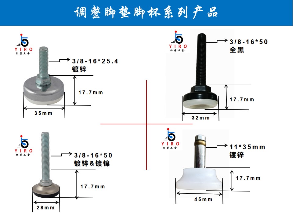 此系列脚垫产品尺寸底部直径有25mm, 28mm, 32mm, 35mm, 45mm, 60mm, 75mm;